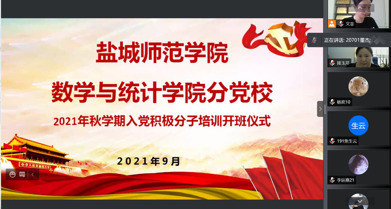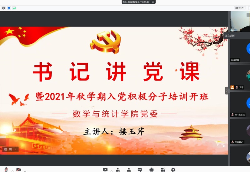 922日下午,beat365亚洲体育官方网站线上举行了2021年秋学期入党积极分子培训开班仪式。数学与统计公司党委书记接玉芹出席活动并讲授专题党课。员工支部书记、全体入党积极分子参加了本次活动