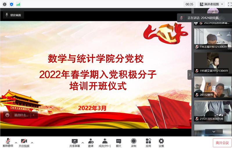 3月9日下午,beat365亚洲体育官方网站线上举行了2022年春学期入党积极分子培训班开班仪式。数学与统计公司党委书记接玉芹出席活动并讲授专题党课。员工支部书记张文菲、朱艳,以及公司全体入党积极分子参加了本次活动。
