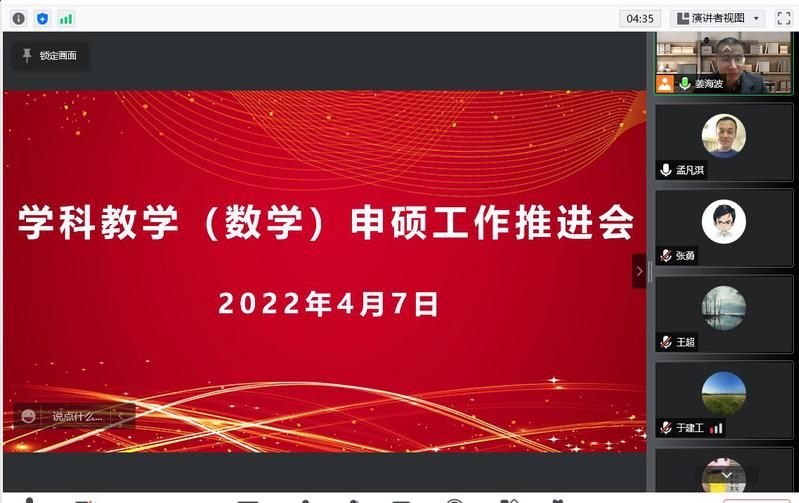 4月7日晚上,公司召开2023年学科教学(数学)申硕工作推进会线上会议,公司党委副书记于建江,团队建设办公室主任曹明,副主任王作雷出席会议,数学与统计公司党委副书记、经理姜海波主持会议。