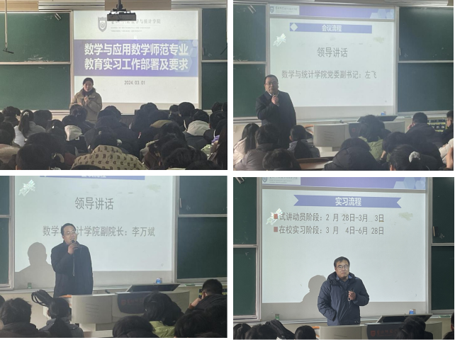 2024年3月1日下午, beat365亚洲体育官方网站在教学主楼B101教室举行了2021级数学师范专业员工教育实习动员会。数学与统计公司党委书记接玉芹,副书记左飞,副经理李万斌,数学系主任任颜波,副主任徐海龙等老师以及2021级数学师范专业全体同学参加会议,任颜波主持会议。