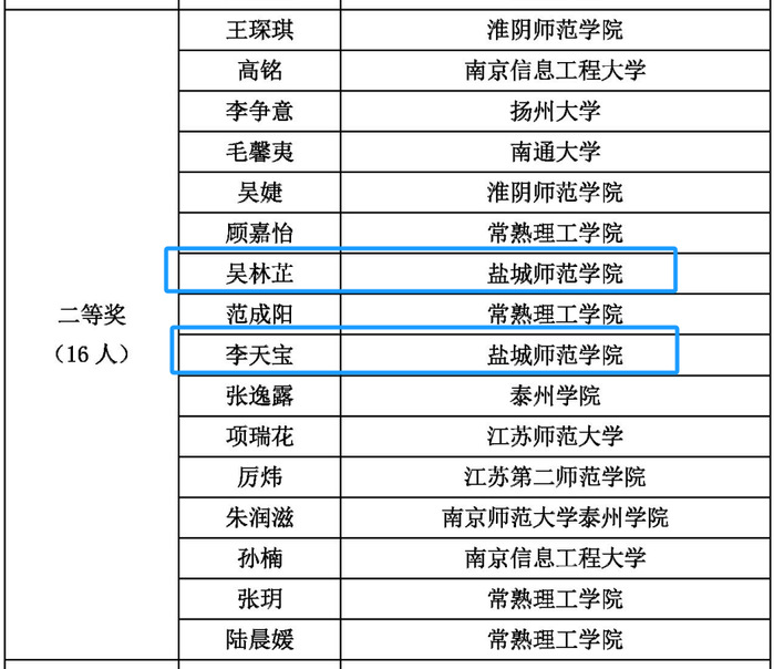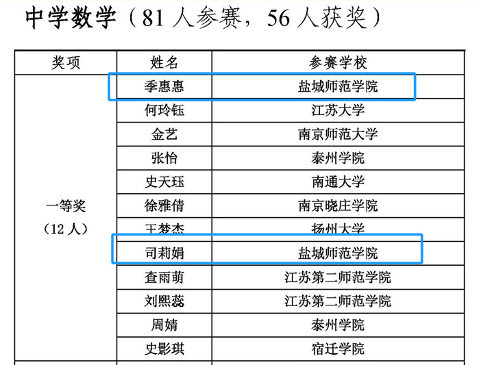 日前,第十三届江苏省师范生教学基本功大赛比赛结果揭晓,beat365亚洲体育官方网站参赛选手在中学理科组(数学)比赛中再创佳绩,季惠惠、司莉娟荣获一等奖,李天宝、吴林芷荣获二等奖,王榆涵、许倩楠荣获三等奖,其中季惠惠同学以一等奖第一名的成绩被推荐参加长三角师范生教学基本功大赛。