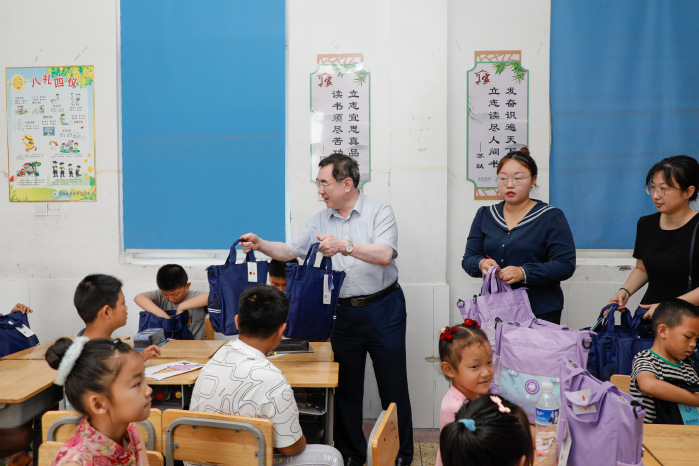 在羊寨镇中心小学,庞波走进暑托班课堂,与留守儿童亲切交流,详细了解他们的学习和生活状况,并为他们送上了精心准备的学习用品。他勉励志愿者们充分发挥专业优势,将理论知识转化为教学实践创新,通过丰富多彩的教学活动,为乡村儿童打开知识的新窗口。